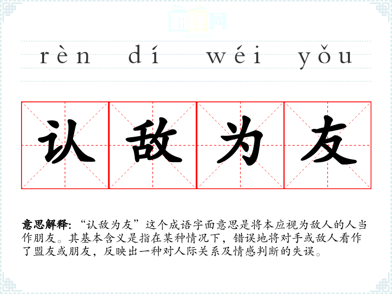 “认敌为友”这个成语字面意思是将本应视为敌人的人当作朋友。其基本含义是指在某种情况下,错误地将对手或敌人看作了盟友或朋友,反映出一种对人际关系及情感判断的失误。