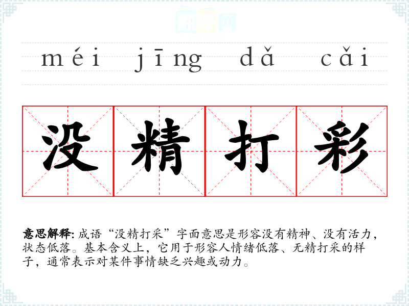 成语“没精打采”字面意思是形容没有精神、没有活力,状态低落。基本含义上,它用于形容人情绪低落、无精打采的样子,通常表示对某件事情缺乏兴趣或动力。