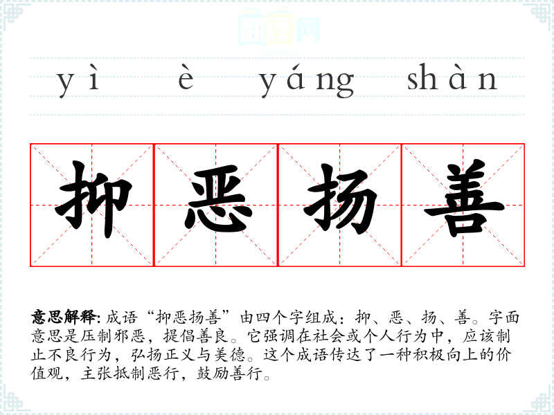 - 扬善抑恶:与“抑恶扬善”意思相近,强调提倡善良与制止恶行。