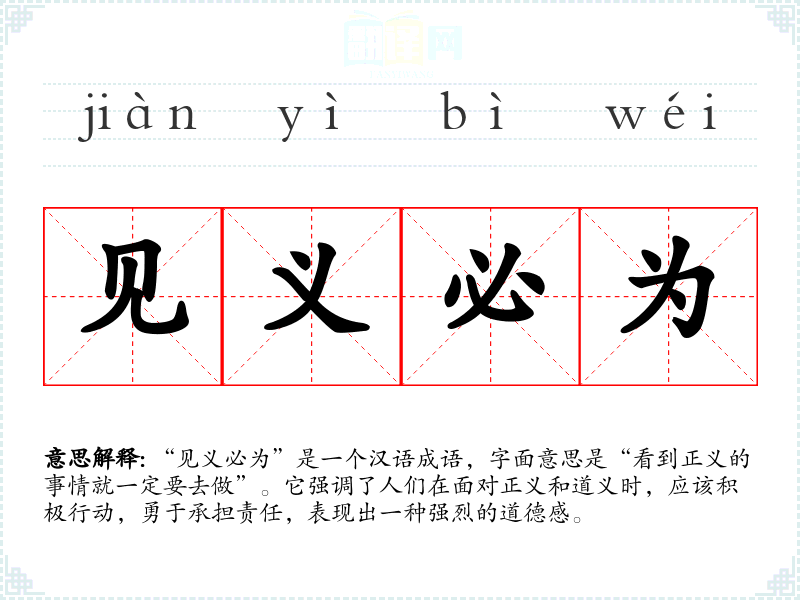 “见义必为”是一个汉语成语,字面意思是“看到正义的事情就一定要去做”。它强调了人们在面对正义和道义时,应该积极行动,勇于承担责任,表现出一种强烈的道德感。