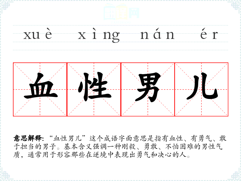 “血性男儿”这个成语字面意思是指有血性、有勇气、敢于担当的男子。基本含义强调一种刚毅、勇敢、不怕困难的男性气质,通常用于形容那些在逆境中表现出勇气和决心的人。