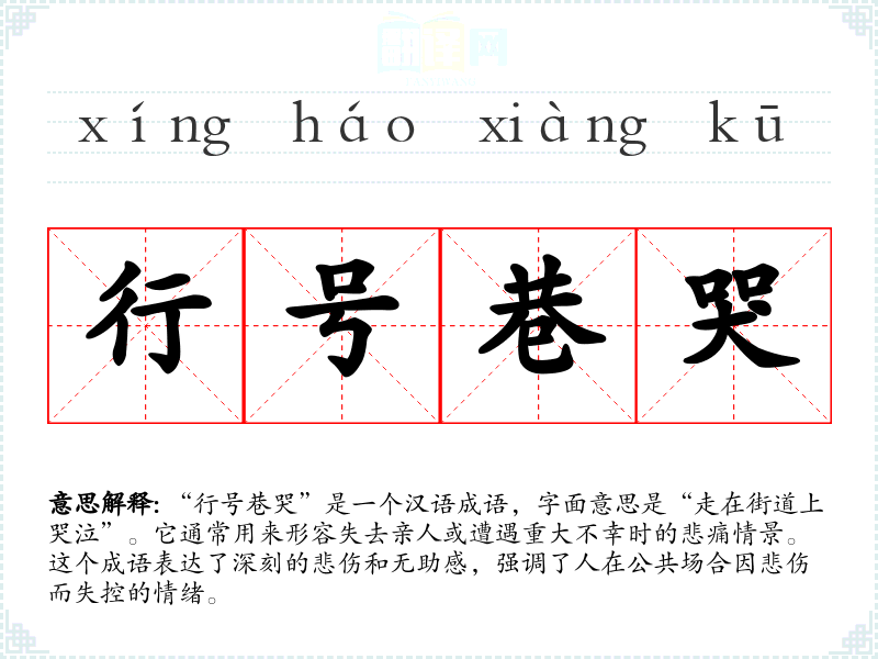 “行号巷哭”是一个汉语成语,字面意思是“走在街道上哭泣”。它通常用来形容失去亲人或遭遇重大不幸时的悲痛情景。这个成语表达了深刻的悲伤和无助感,强调了人在公共场合因悲伤而失控的情绪。