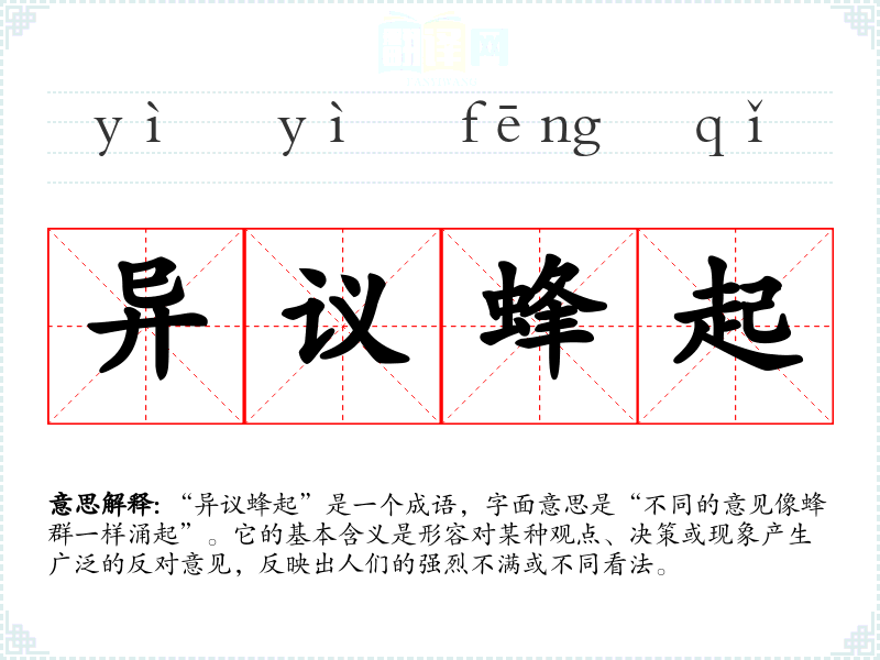 “异议蜂起”是一个成语,字面意思是“不同的意见像蜂群一样涌起”。它的基本含义是形容对某种观点、决策或现象产生广泛的反对意见,反映出人们的强烈不满或不同看法。