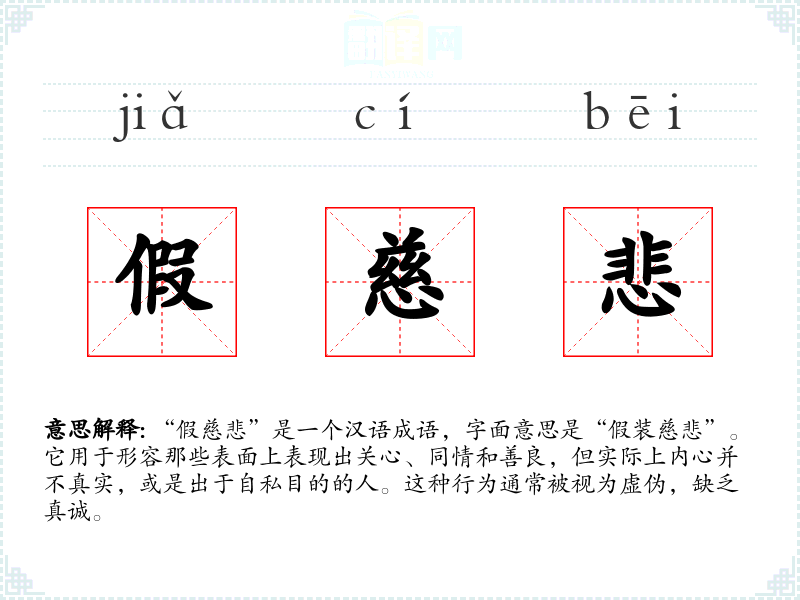 “假慈悲”并没有特定的历史典故或文学出处,但它的构成非常直观。“假”意为假装、虚假;“慈悲”则指关心、怜悯之情。这个成语反映了人们对表面善良的怀疑和对真实情感的渴望,通常在批评那些伪善者时使用。