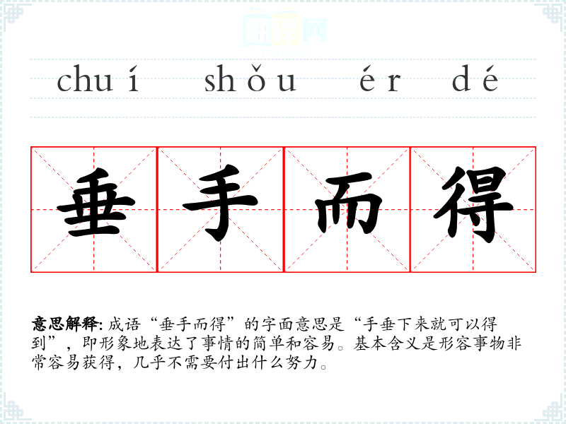 成语“垂手而得”的字面意思是“手垂下来就可以得到”,即形象地表达了事情的简单和容易。基本含义是形容事物非常容易获得,几乎不需要付出什么努力。
