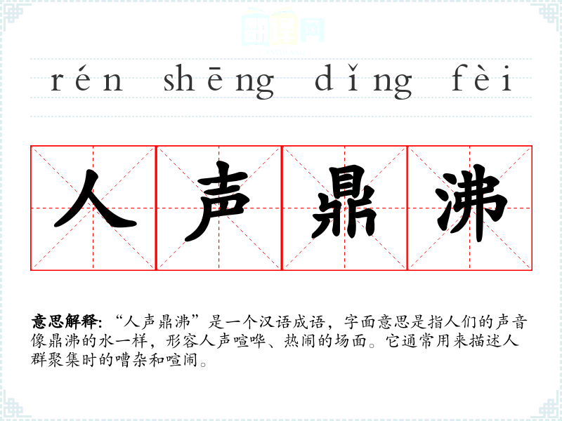 该成语的来源并不明确,但可以追溯到古代的宴会和**场景。当时人们聚集在一起,谈笑风生,声音交织在一起,形成一种热闹的氛围。成语中“鼎”字的使用,可能源于古代烹饪时的鼎声,象征着一种热烈和生动的场面。