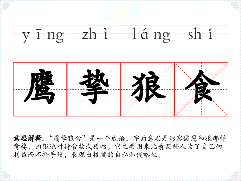 “鹰挚狼食”是一个成语,字面意思是形容像鹰和狼那样贪婪、凶狠地对待食物或猎物。它主要用来比喻某些人为了自己的利益而不择手段,表现出极端的自私和侵略性。