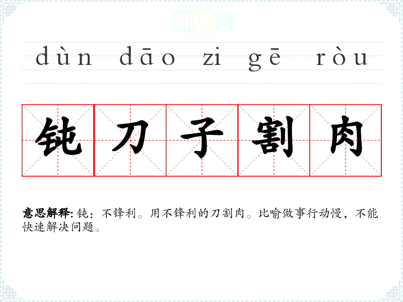 | 钝刀子割肉 | 钝:不锋利。用不锋利的刀割肉。比喻做事行动慢,不能快速解决问题。 |