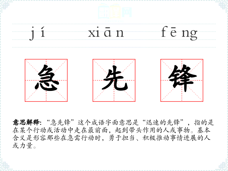 “急先锋”这个成语字面意思是“迅速的先锋”,指的是在某个行动或活动中走在最前面,起到带头作用的人或事物。基本含义是形容那些在急需行动时,勇于担当、积极推动事情进展的人或力量。