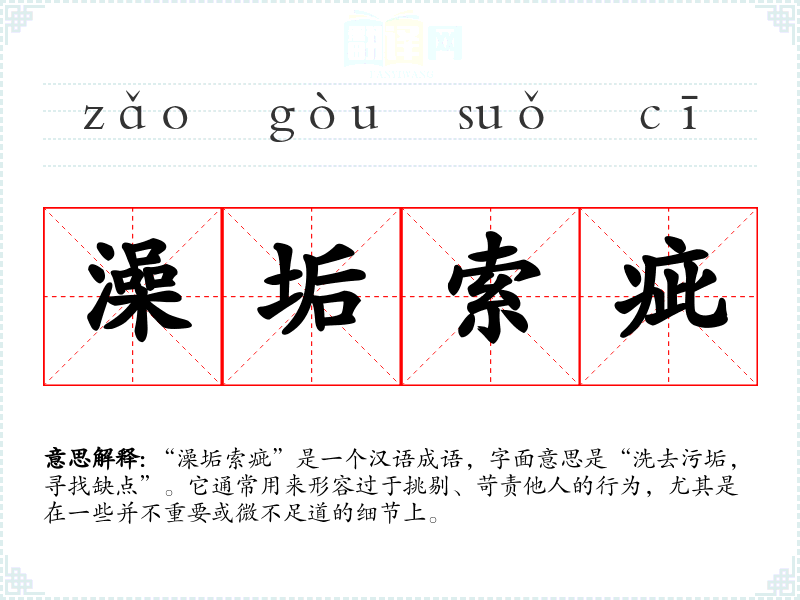 | 澡垢索疵 | 犹言吹毛求疵。指刻意寻人过错。 |