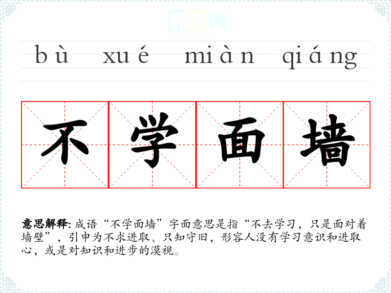 成语“不学面墙”字面意思是指“不去学习,只是面对着墙壁”,引申为不求进取、只知守旧,形容人没有学习意识和进取心,或是对知识和进步的漠视。