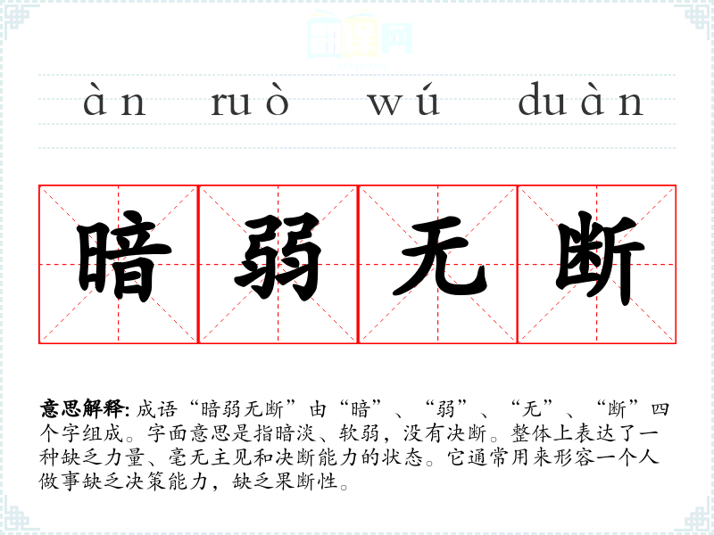 成语“暗弱无断”由“暗”、“弱”、“无”、“断”四个字组成。字面意思是指暗淡、软弱,没有决断。整体上表达了一种缺乏力量、毫无主见和决断能力的状态。它通常用来形容一个人做事缺乏决策能力,缺乏果断性。