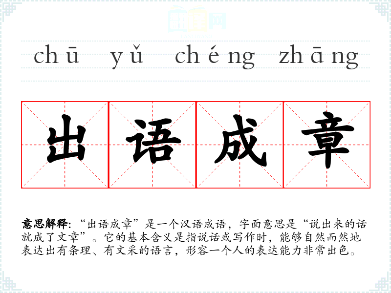 “出语成章”是一个汉语成语,字面意思是“说出来的话就成了文章”。它的基本含义是指说话或写作时,能够自然而然地表达出有条理、有文采的语言,形容一个人的表达能力非常出色。