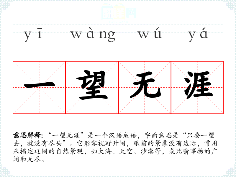 | 一望无垠 | 辽远广阔,看不到边际。 |