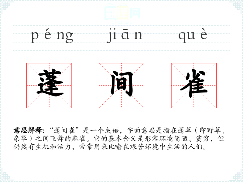 “蓬间雀”是一个成语,字面意思是指在蓬草(即野草、杂草)之间飞舞的麻雀。它的基本含义是形容环境简陋、贫穷,但仍然有生机和活力,常常用来比喻在艰苦环境中生活的人们。