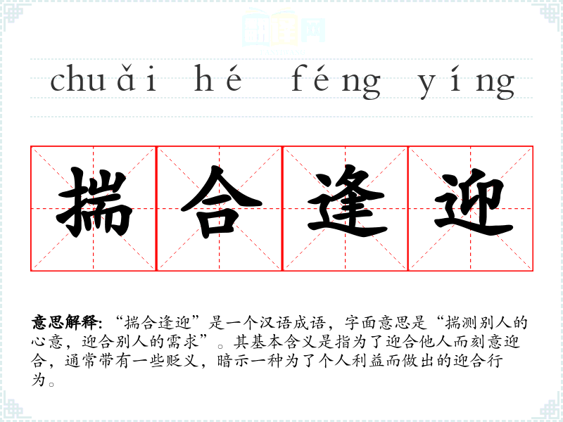 | 揣合逢迎 | 揣:揣测,揣摩。现指揣摩、迎合权贵的心意,以谋求私利。 |