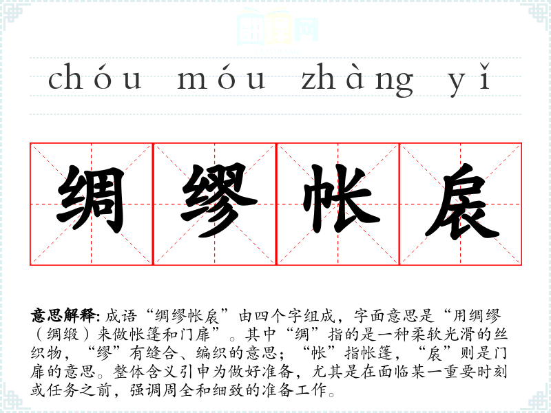 成语“绸缪帐扆”由四个字组成,字面意思是“用绸缪(绸缎)来做帐篷和门扉”。其中“绸”指的是一种柔软光滑的丝织物,“缪”有缝合、编织的意思;“帐”指帐篷,“扆”则是门扉的意思。整体含义引申为做好准备,尤其是在面临某一重要时刻或任务之前,强调周全和细致的准备工作。