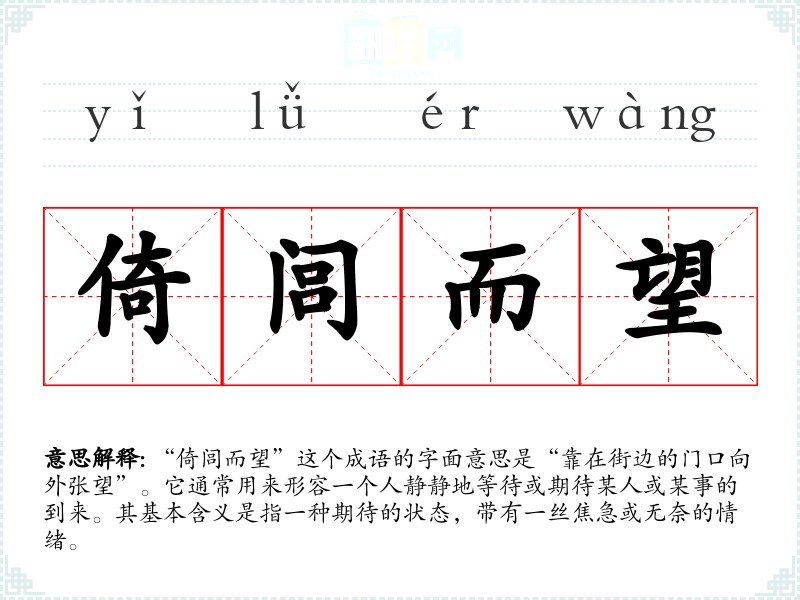“倚闾而望”这个成语的字面意思是“靠在街边的门口向外张望”。它通常用来形容一个人静静地等待或期待某人或某事的到来。其基本含义是指一种期待的状态,带有一丝焦急或无奈的情绪。