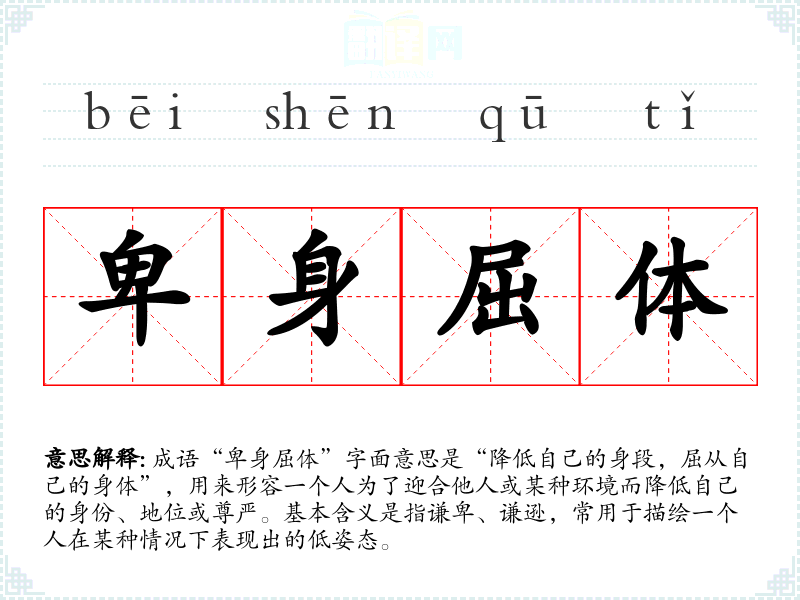 成语“卑身屈体”字面意思是“降低自己的身段,屈从自己的身体”,用来形容一个人为了迎合他人或某种环境而降低自己的身份、地位或尊严。基本含义是指谦卑、谦逊,常用于描绘一个人在某种情况下表现出的低姿态。
