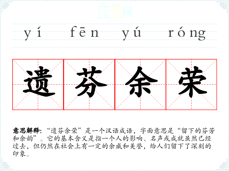 - 日常对话:谈论已故亲友或前辈的成就,比如“虽然她已经离开我们,但她的善行将遗芬余荣,永远铭刻在我们心中。”
