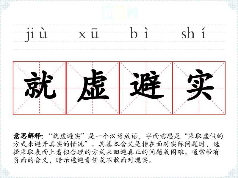 该成语的具体出处并不明确,但可以从其字面构成推测其历史背景。成语中的“虚”和“实”反映了古代哲学中对“虚幻”和“真实”概念的思考,尤其在道家和儒家思想中。“就虚避实”体现了人们在处理复杂问题时的心理策略,反映了人们对于面对困难的逃避态度。