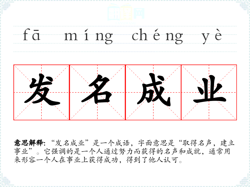 “发名成业”是一个成语,字面意思是“取得名声,建立事业”。它强调的是一个人通过努力而获得的名声和成就,通常用来形容一个人在事业上获得成功,得到了他人认可。