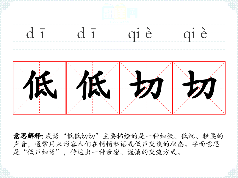 成语“低低切切”主要描绘的是一种细微、低沉、轻柔的声音,通常用来形容人们在悄悄私语或低声交谈的状态。字面意思是“低声细语”,传达出一种亲密、谨慎的交流方式。