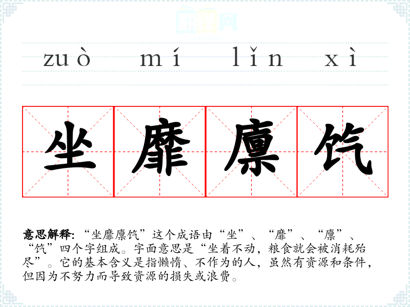 “坐靡廪饩”这个成语由“坐”、“靡”、“廪”、“饩”四个字组成。字面意思是“坐着不动,粮食就会被消耗殆尽”。它的基本含义是指懒惰、不作为的人,虽然有资源和条件,但因为不努力而导致资源的损失或浪费。