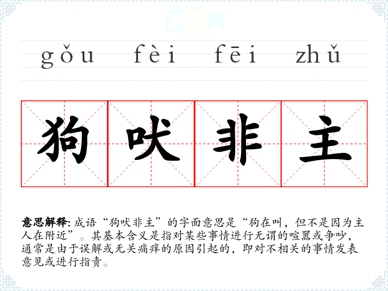 成语“狗吠非主”的字面意思是“狗在叫,但不是因为主人在附近”。其基本含义是指对某些事情进行无谓的喧嚣或争吵,通常是由于误解或无关痛痒的原因引起的,即对不相关的事情发表意见或进行指责。