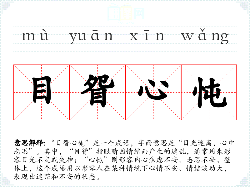 “目眢心忳”是一个成语,字面意思是“目光迷离,心中忐忑”。其中,“目眢”指眼睛因情绪而产生的迷乱,通常用来形容目光不定或失神;“心忳”则形容内心焦虑不安、忐忑不安。整体上,这个成语用以形容人在某种情境下心情不安、情绪波动大,表现出迷茫和不安的状态。