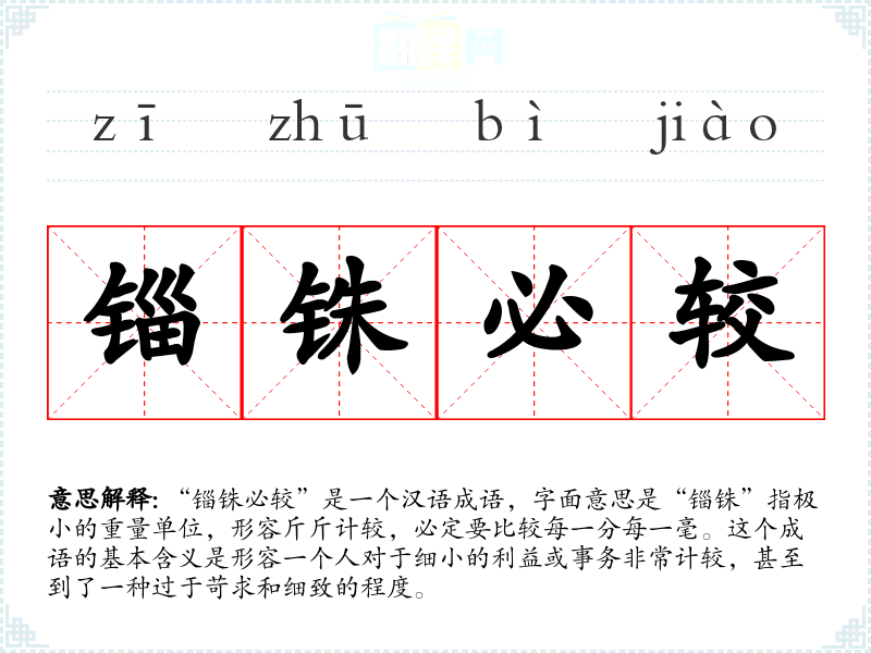“锱铢必较”是一个汉语成语,字面意思是“锱铢”指极小的重量单位,形容斤斤计较,必定要比较每一分每一毫。这个成语的基本含义是形容一个人对于细小的利益或事务非常计较,甚至到了一种过于苛求和细致的程度。