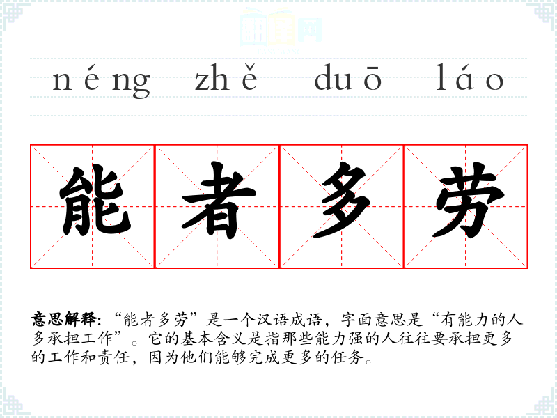 “能者多劳”是一个汉语成语,字面意思是“有能力的人多承担工作”。它的基本含义是指那些能力强的人往往要承担更多的工作和责任,因为他们能够完成更多的任务。