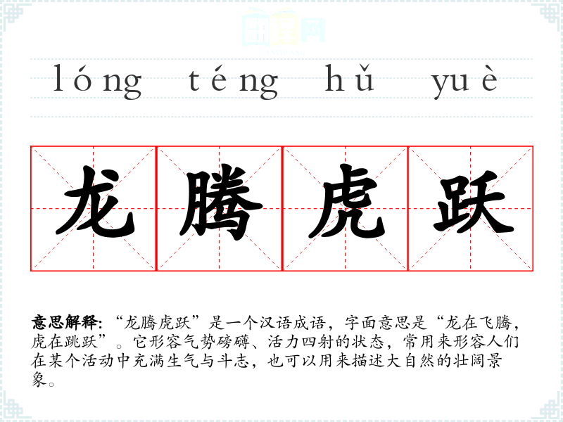 “龙腾虎跃”是一个汉语成语,字面意思是“龙在飞腾,虎在跳跃”。它形容气势磅礴、活力四射的状态,常用来形容人们在某个活动中充满生气与斗志,也可以用来描述大自然的壮阔景象。