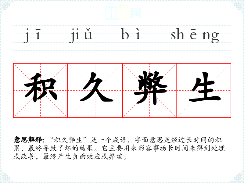 “积久弊生”是一个成语,字面意思是经过长时间的积累,最终导致了坏的结果。它主要用来形容事物长时间未得到处理或改善,最终产生负面效应或弊端。