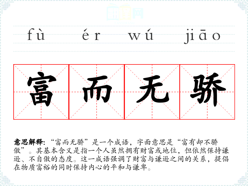 “富而无骄”是一个成语,字面意思是“富有却不骄傲”。其基本含义是指一个人虽然拥有财富或地位,但依然保持谦逊、不自傲的态度。这一成语强调了财富与谦逊之间的关系,提倡在物质富裕的同时保持内心的平和与谦卑。