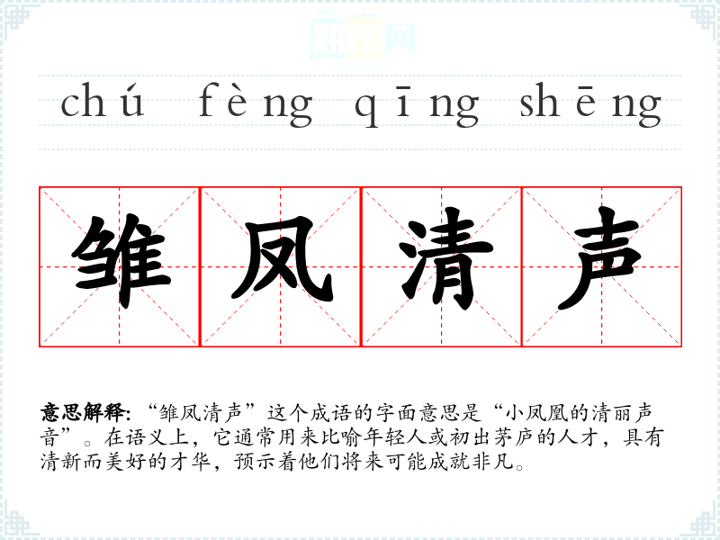 “雏凤清声”这个成语的字面意思是“小凤凰的清丽声音”。在语义上,它通常用来比喻年轻人或初出茅庐的人才,具有清新而美好的才华,预示着他们将来可能成就非凡。