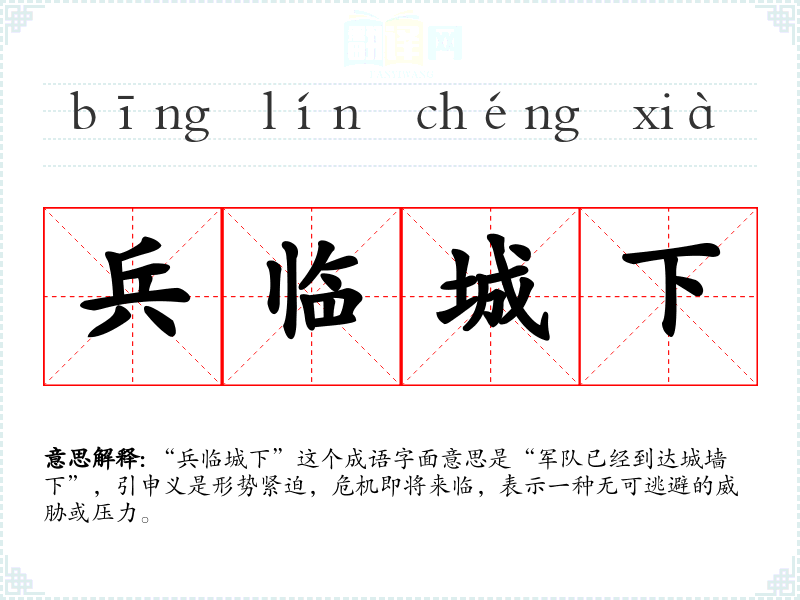 “兵临城下”这个成语字面意思是“军队已经到达城墙下”,引申义是形势紧迫,危机即将来临,表示一种无可逃避的威胁或压力。