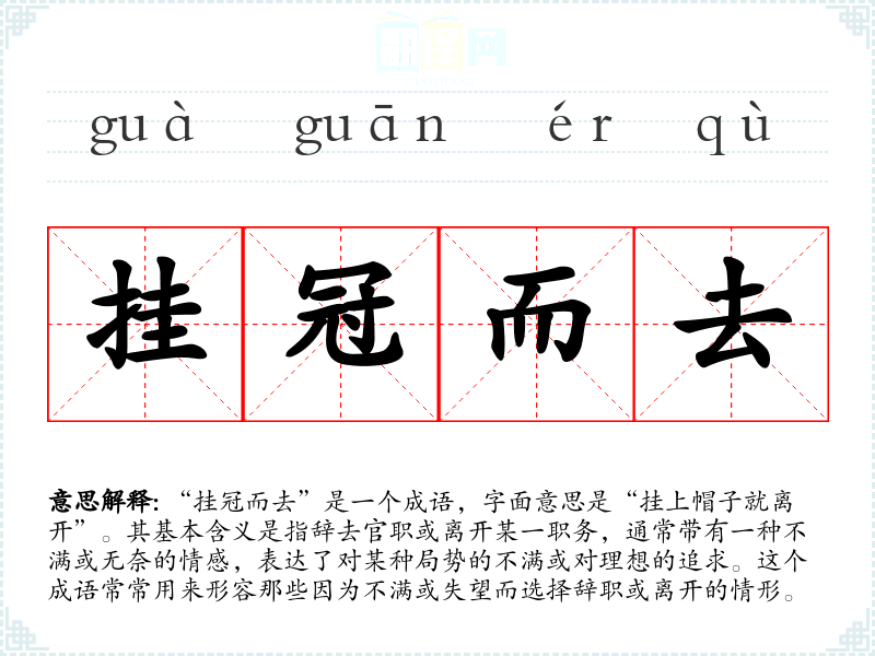 “挂冠而去”是一个成语,字面意思是“挂上帽子就离开”。其基本含义是指辞去官职或离开某一职务,通常带有一种不满或无奈的情感,表达了对某种局势的不满或对理想的追求。这个成语常常用来形容那些因为不满或失望而选择辞职或离开的情形。