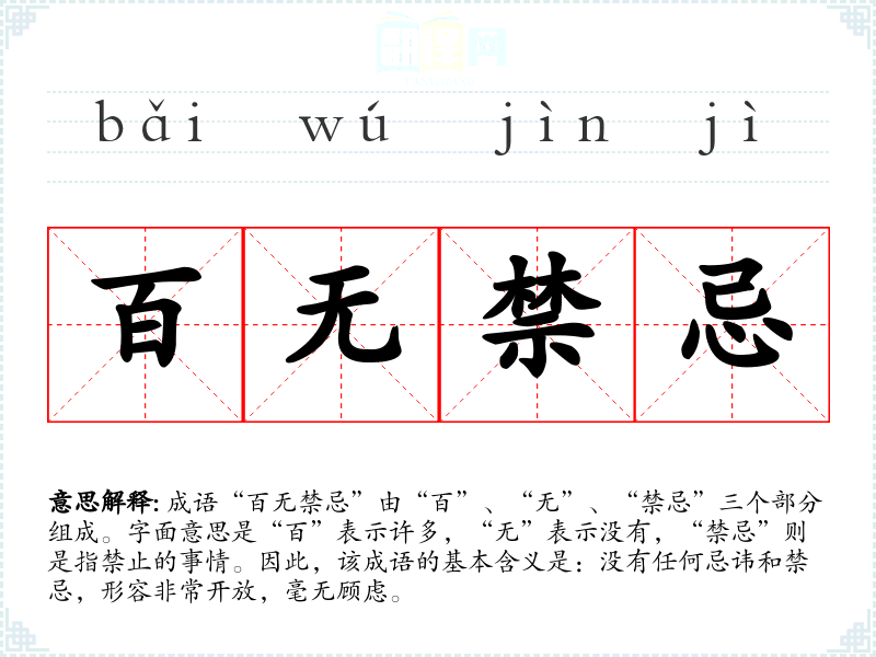 成语“百无禁忌”由“百”、“无”、“禁忌”三个部分组成。字面意思是“百”表示许多,“无”表示没有,“禁忌”则是指禁止的事情。因此,该成语的基本含义是:没有任何忌讳和禁忌,形容非常开放,毫无顾虑。