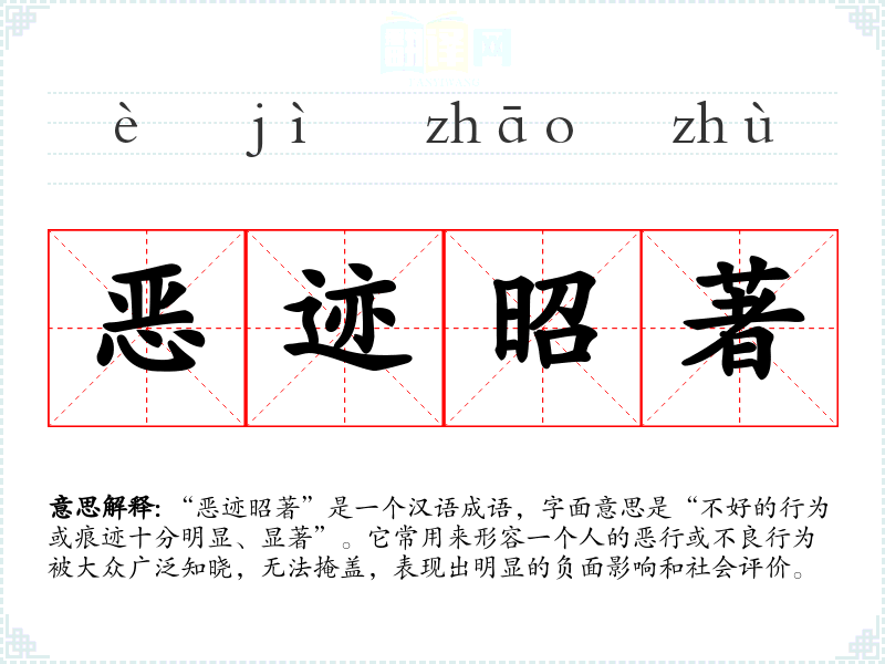 “恶迹昭著”是一个汉语成语,字面意思是“不好的行为或痕迹十分明显、显著”。它常用来形容一个人的恶行或不良行为被大众广泛知晓,无法掩盖,表现出明显的负面影响和社会评价。
