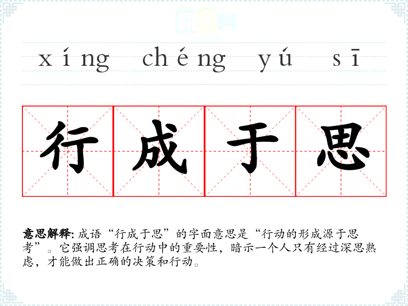 成语“行成于思”的字面意思是“行动的形成源于思考”。它强调思考在行动中的重要性,暗示一个人只有经过深思熟虑,才能做出正确的决策和行动。