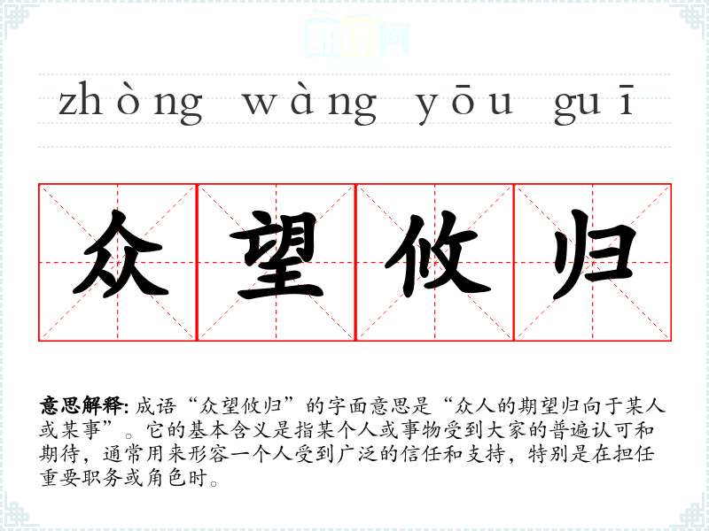 成语“众望攸归”的字面意思是“众人的期望归向于某人或某事”。它的基本含义是指某个人或事物受到大家的普遍认可和期待,通常用来形容一个人受到广泛的信任和支持,特别是在担任重要职务或角色时。
