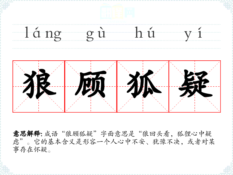 成语“狼顾狐疑”字面意思是“狼回头看,狐狸心中疑虑”。它的基本含义是形容一个人心中不安、犹豫不决,或者对某事存在怀疑。