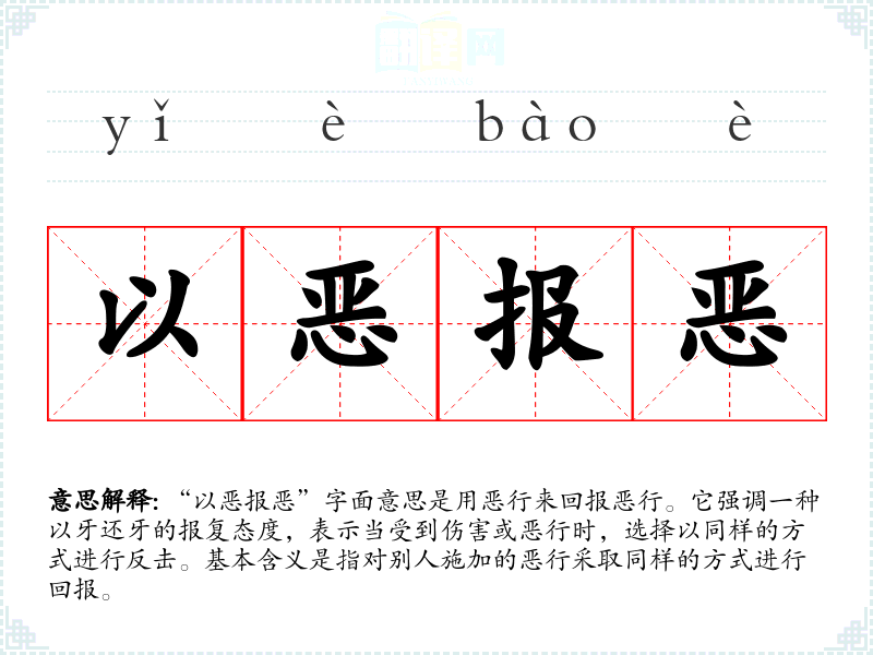 “以恶报恶”字面意思是用恶行来回报恶行。它强调一种以牙还牙的报复态度,表示当受到伤害或恶行时,选择以同样的方式进行反击。基本含义是指对别人施加的恶行采取同样的方式进行回报。