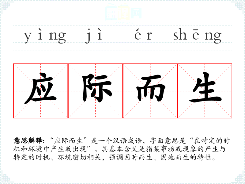 “应际而生”是一个汉语成语,字面意思是“在特定的时机和环境中产生或出现”。其基本含义是指某事物或现象的产生与特定的时机、环境密切相关,强调因时而生、因地而生的特性。