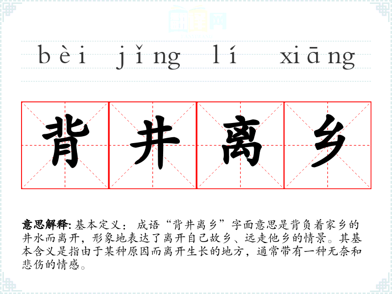 基本定义: 成语“背井离乡”字面意思是背负着家乡的井水而离开,形象地表达了离开自己故乡、远走他乡的情景。其基本含义是指由于某种原因而离开生长的地方,通常带有一种无奈和悲伤的情感。