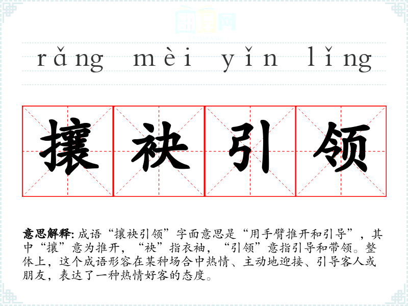 成语“攘袂引领”字面意思是“用手臂推开和引导”,其中“攘”意为推开,“袂”指衣袖,“引领”意指引导和带领。整体上,这个成语形容在某种场合中热情、主动地迎接、引导客人或朋友,表达了一种热情好客的态度。
