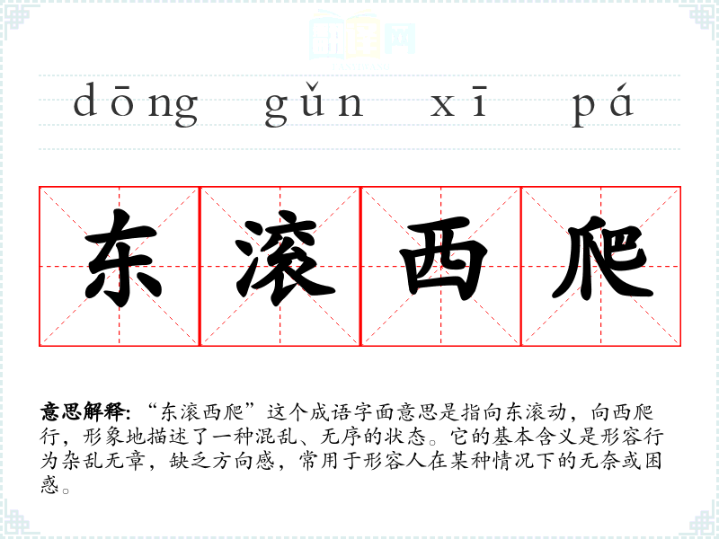 “东滚西爬”这个成语字面意思是指向东滚动,向西爬行,形象地描述了一种混乱、无序的状态。它的基本含义是形容行为杂乱无章,缺乏方向感,常用于形容人在某种情况下的无奈或困惑。