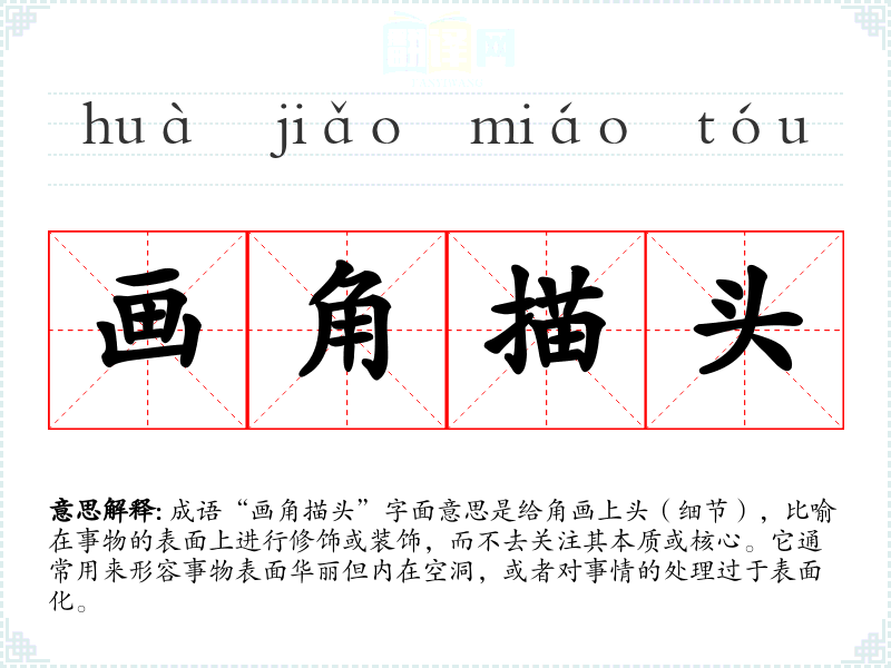 成语“画角描头”字面意思是给角画上头(细节),比喻在事物的表面上进行修饰或装饰,而不去关注其本质或核心。它通常用来形容事物表面华丽但内在空洞,或者对事情的处理过于表面化。