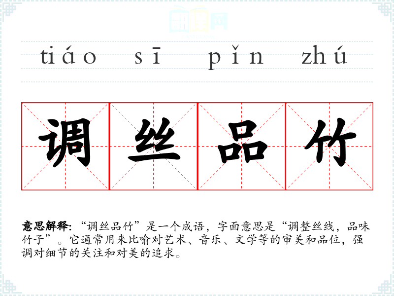 “调丝品竹”是一个成语,字面意思是“调整丝线,品味竹子”。它通常用来比喻对艺术、音乐、文学等的审美和品位,强调对细节的关注和对美的追求。